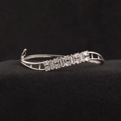 Add a touch of modern elegance to your look with this stunning pair of Guaranteed AD Bangles, beautifully crafted with Rhodium Plating. Designed for today’s woman, this bangle set blends traditional charm with a contemporary finish, making it ideal for special occasions, parties, office wear, or gifting. The brilliant American Diamond stones sparkle with every move, offering a refined and luxurious feel. Style it effortlessly with sarees, Indian suits, kurtis, formals, or gowns to enhance your ensemble with grace and sophistication. This versatile piece from our Modern Collection is a must-have accessory for a timeless and polished appearance.