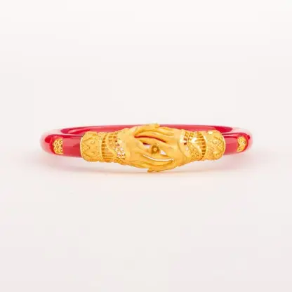 Discover the charm of our Gold Plated Bracelet Style Pola Badhano bangles. Ideal for traditional occasions, everyday wear, office settings, or festive celebrations, these bangles feature a captivating blend of red and golden tones. The absence of chabi infuses a contemporary essence into the design, while the intricate hand and floral motifs evoke a sense of artistic elegance. The gold plating ensures durability and lasting shine, making them perfect for daily wear or adorning your outfit for special events. Pair them effortlessly with sarees or kurtis, embodying traditional grace with a touch of modern sophistication from our esteemed Traditional Collection.