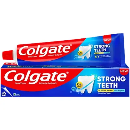Paste hi Nahi, Daanto Ka Poshan! Our teeth lose calcium every time we eat sugary foods and get weaker over time. Colgate Strong Teeth has a unique Calcium Boost + Arginine formula which restores natural calcium back to your teeth and nourishes them. Resulting in 2X stronger teeth vs usage of regular toothpaste. Colgate Strong Teeth toothpaste also helps prevent cavities, whitens teeth, and freshens breath with regular use.