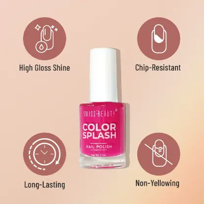 Introducing Swiss Beauty Color Splash Nail Polish for nails that grab attention and make a statement every time. Each shade is highly pigmented, ensuring a rich, vivid colour that effortlessly glides onto your nails, providing a flawless, shiny finish in just one coat.