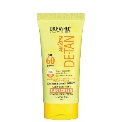DR.Rashel’s Detan SPF 60 PA+++ sunscreen provides broad-spectrum UVA/UVB protection, reduces existing tan with vitamin C, and suits all skin types, dry or oily.
