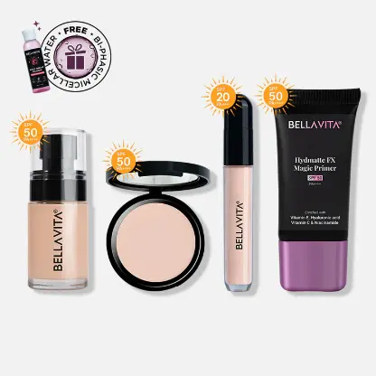 Achieve a flawless, airbrush-like finish with the Everyday Face Fix Combo. Start with the Hydmatte FX Magic Primer, infused with Vitamin E, Hyaluronic Acid, and Niacinamide, to smoothen skin, minimize pores, and protect with SPF 50. Follow with the Hydmatte FX Airbrush Foundation for a radiant, skin-like finish that hydrates, brightens, and blurs imperfections. Complete your look with the Hydmatte FX Magic Concealer, offering exceptional coverage for blemishes and dark circles while nourishing and protecting with SPF 20. Lastly, set it up with our Airbrush Compact powder with SPF 50 which seals in everything while giving your skin sun protection. As a bonus, get the Magic Micellar Cleanser free to gently and effectively remove even waterproof makeup while keeping your skin fresh and hydrated