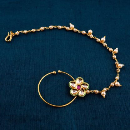 Introducing our exquisite Kundan Bridal Nath, designed for weddings and traditional bridal wear. This stunning piece features a beautiful floral design adorned with radiant ruby-colored stones, adding a touch of elegance and sophistication. Perfectly suited for pairing with sarees and lehengas, this nath enhances your bridal look with timeless charm. Suitable for all regions, it showcases the finest traditional craftsmanship, making it an essential accessory for brides seeking to make a memorable statement. Elevate your bridal ensemble with this captivating Kundan Nath, blending rich color and intricate design for a truly elegant and enchanting appearance.