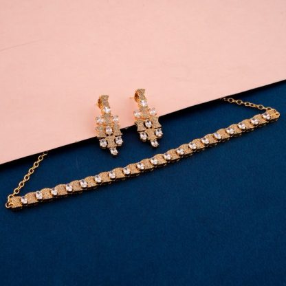 Introducing our exquisite Mini White CZ-American Diamond Necklace Set, a versatile adornment for special occasions, festive wear, and parties. This modern piece, featuring lustrous American Diamonds in a pristine white hue, is the epitome of timeless elegance. The gold plating adds a touch of sophistication, making it suitable for all regions. Ideal for styling with sarees, lehengas, gowns, and Indian suits, this mini set complements diverse ensembles. Elevate your look with the perfect blend of contemporary design and classic allure. Make a radiant statement at any event with our Mini White CZ-American Diamond Necklace Set, symbolizing refined taste and enduring beauty.