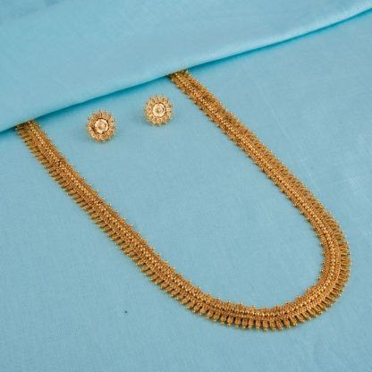 Adorn yourself with the opulent charm of our Gold-Plated Long Necklace Set, designed to be the highlight of weddings, special occasions, and traditional celebrations. The radiant golden hue and intricate design are perfect complements to your elegant saree attire. This hansuli-style set is adorned with meticulous gold plating, ensuring it captivates all eyes with its regal allure. Whether you’re the bride or a guest, this necklace set will elevate your look to new heights of beauty and sophistication. Embrace tradition with a touch of modernity, and make a statement at your next event with this stunning piece of jewelry.