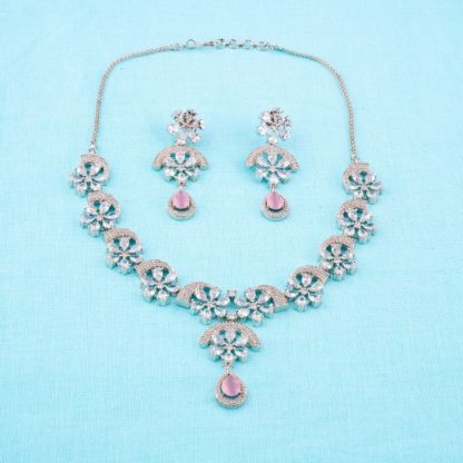 Introducing our Mini Pink CZ-American Diamond Necklace Set, a charming epitome of grace and style. The lovely Pink CZ-American Diamonds harmonize flawlessly with the shimmer of White CZ-American Diamonds, exuding a delicate beauty. Adorned with Rhodium Plating for a lasting shine, this set is perfect for parties, special occasions, or festive gatherings. Its petite size and modern design make it ideal to pair with sarees, kurtis, or Indian suits, elevating your ensemble. The Pink and White CZ-American Diamonds blend seamlessly, infusing a touch of sophistication and feminine allure, making this set a must-have in your jewelry collection.