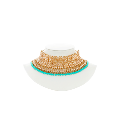 This necklace set consists of a pair of earrings, a choker, and a maang tikka. Gold-plated with reverse American diamond and aqua stone embellishments, this beaded traditional set is perfect for today’s bride. This necklace set has a floral design and an understated subtle look. If you want to look simple yet classic on your wedding day, then this aqua coloured set is perfect for you. It has been inspired from traditional Indian jewels and will look great when paired with a saree. Exude confidence with this sparkling set and collect compliments when you wear it on your big day.