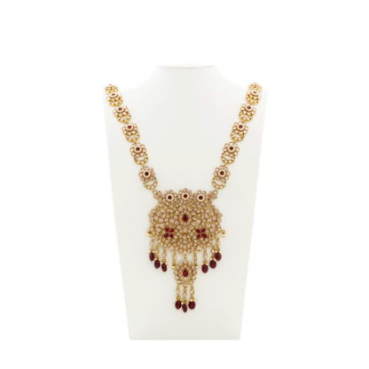 Complete your wedding look with this traditional necklace set and look gorgeous at the next big event. This set can be worn with all kinds of ethnic attires. This necklace is the ideal combination of traditional and modern design. It has reverse American diamond embellishments with red stones set in a floral pattern. The pendant is big and has intricate detailing. This set comes with a pair of matching earrings and a maang tikka. Look like a queen with this luxurious and heavy long set on your big day.
