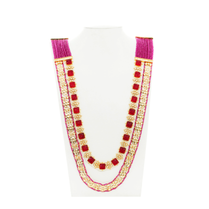 This is a multi-layered, beaded lahari set designed as per the latest jewellery trends. Semi-precious ruby and Kundan stones with pink beads make this necklace look very classy and stylish. The long design of the necklace is inspired from royal Rajasthani necklaces and the jhumka type earrings enhance its overall effect. This set is perfect for traditional and ethnic outfits. It is the ideal choice for weddings, parties, and other festivities. This set can make for a great gift to anyone as well. It will not only look great on any woman, but will also instil them with social confidence when they wear it.