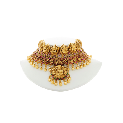 Gold-plated antique necklace with a dull finish, embellished with ruby and green stones. The necklace has goddess and peacock motifs. This Traditional hasli is studded with pink stones and gold balls with faux pearls hanging all over the bottom. This carved religious temple necklace has been crafted with attention to detail and includes a pair of matching temple earrings. This set is perfect for Indian sarees and can be confidently worn at weddings. The design for this necklace has been inspired from South India. This set will last for a long time if you take good care of it and keep it away from fragrances and water.
