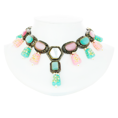 This necklace set contains a necklace and a pair of earrings. This necklace set has a modern Victorian design that can be worn on any special occasion. It has beautiful pink stones with black polish that carry a detailed pattern in golden colour. This is a special Victorian pattern that will look great with gowns of all colours. The earrings have a similar soft-hued colour with cute stone hangings that add a subtle charm to the necklace. This beaded necklace is perfect for night-time as well as daytime events.