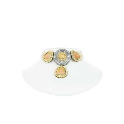 Make this necklace a part of your modern jewellery collection. Try out this AD studded peach beaded high neck choker necklace set. The round trilliant design makes this choker necklace highly stylish. It comes with a pair of matching stud earrings. The earring is secured by a push back closure. The use of high-quality stones makes this necklace stand out. The beautiful polish on the necklace gives it a glamorous look. Perfect choice for special occasions like weddings or festivals or parties. It looks best when paired with any Indian outfit such as a saree. It can go with all colours.