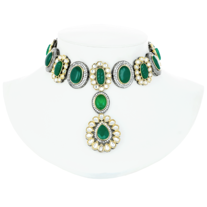 Do you want to enjoy the limelight at an event? Go for this green-toned beadednecklace set with a matching pair of drop earrings. The necklace set and even the earrings come embedded with green and white stones of various sizes and shapes. Featuring a Victorian design this necklace set is perfect for women of all ages. You can team it up with ethnic outfits like an elegant saree. Wear this modern necklace in floral patterns and look stunning. It has a beautiful front drop for highlighting the neck area. Try to wear it during special occasions like any wedding function or anniversary and get loads of compliments.
