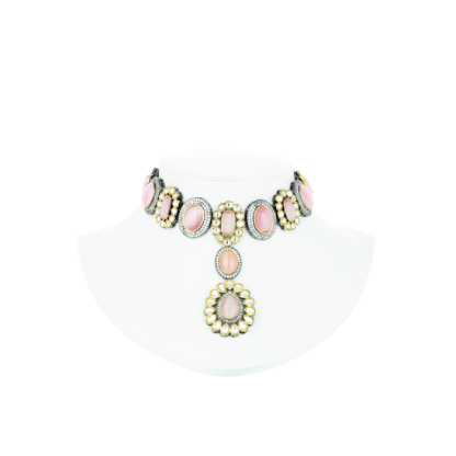 Featuring a modern choker necklace set embellished with light pink and white semi precious stones with a double stone drop. This jewellery set has a trendy floral design and can be paired with sarees of any colour. This set consists of a necklace and a pair of matching drop earrings. To craft this necklace, the artisans have taken inspiration from Victorian design. It can add some charm to one’s look. This beaded set is perfect for special occasions, such as parties, weddings, and any festivals. This necklace comes with a floral detailing work on it. The necklace remains beautifully secured with a drawstring.