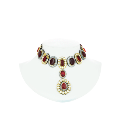 Get ready to add an ethereal touch to your ensemble with this necklace and matching earring. Crafted with superior quality material it features lovely oval stone work. This modern jewellery set is a perfect amalgamation of timeless beauty and contemporary charm. The touch of semi precious stones and red stone drops makes this Victorian style necklace a versatile piece of jewellery. You can adorn it with traditional outfits such as sarees of any colour and steal the show. Pair the floral inspired necklace with beaded details to get a complete chic look. Perfect to wear it during special occasions.