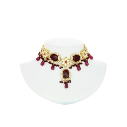 The jewellery set consists of a necklace and a pair of earrings. The floral shaped earrings with stone and beaded droppings goes well with the necklace set that also contains some floral design. The bead drops add a charm to this jewellery piece. Team this beautiful Kundan jewellery with any traditional attire during special occasions. You can wear them with sarees of any colour. This necklace set comes with embedded white and rubicoloured stones. You should definitely make this a part of your jewellery collection. But remember that fashion jewellery will last long only if you keep it away from chemicals.