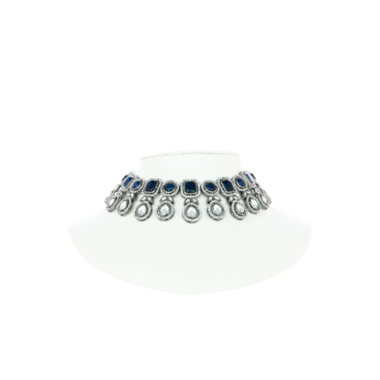Enchant everyone around you by wearing this fusion necklace set. It comes with a pair of matching drop earrings secured with a push back closure. The necklace comes embellished with blue coloured stones in different shapes and sizes. With this marvellous piece of beauty, you can easily accentuate your ethnic look. Ideal for modern day women who wants minimalistic designs for their necklace or earrings. You will surely look like a diva when you pair it with traditional attires, like all types of saree. This set is suitable for special occasions, like weddings or parties or anniversaries, and more. Store the necklace piece in a moisture free box to prevent accidental damage.
