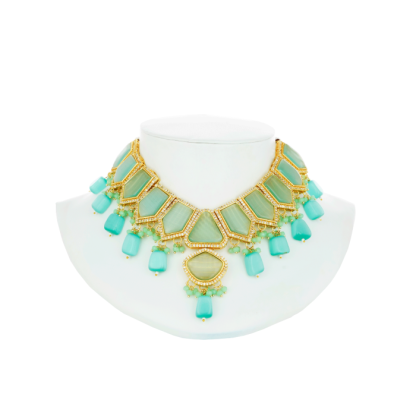 This gold-plated necklace set contains a mint necklace with a matching pair of earrings. This set has a traditional Jaipuri design with geometric shapes of mint stones combined together to create this unique piece. Look chic at any occasion with this beaded necklace set. The matching earrings have white stones with a mint bead droplet that adds colour and contrast to its design. This piece is perfect for women of all ages and can also make for a great gift for your loved ones. This bright necklace set will look good in daytime as well as night-time events.