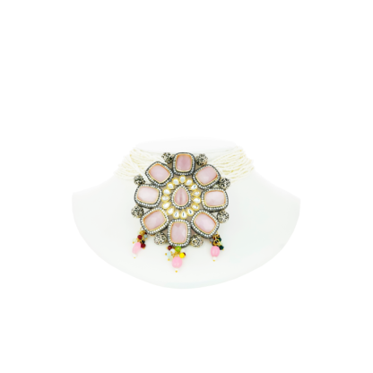 Featuring a classic combination of white and pink in this Victorian necklace set. This set contains a modern necklace with a pair of earrings. The necklace has white beads with a pink floral pendant that will catch everyone’s attention when you wear it. The earrings are simple and have pink stones with multi-coloured bead droplets that add a colourful contrast to this soft-hued set. Pair this soft pink necklace with a saree or gown for a dazzling and elegant ethnic look. This set can be worn on any occasion by women of all ages.