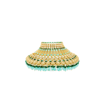 This necklace set contains a necklace, a tayra tikka and a pair of danglers. This is a gold-plated necklace set with mint and green stone embellishments and a beautiful traditional design. The earrings have intricate carvings that add a regal contrast to the mint stones while the hair accessory has a simple yet elegant design, combined this set will help you create a style statement at the next wedding you attend. Pair this set with your lehenga and gather compliments for your traditional look. This mint and green kundan set will make for a great addition to your jewellery collection.