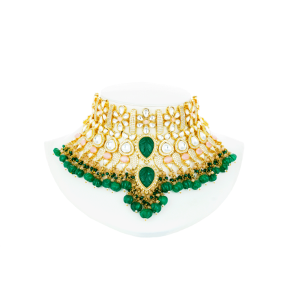 Try this trendy necklace set from the house of Ornazone and become the centre of attraction. This dual-tone choker necklace set comes beaded and studded with colourfulKundans. It has been completely inspired by the rich Rajasthani heritage. Featuring carving stone a stunning floral design, this Kundan necklace set is perfect for adding elegance to the bridal look. You can pair this Kundan Necklace Set with traditional outfits. You can easily try this beaded necklace set with your pastel greenlehenga. It comes with a pair of matching earrings and a maang tika. This jewellery set can be the perfect addition to your bridal trousseau.