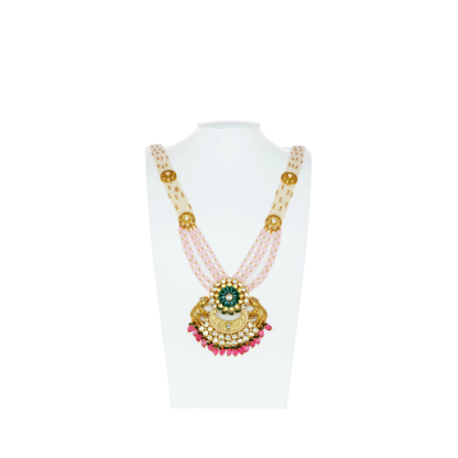 Featuring a bridal necklace set in gold-plating with beautiful elephant motifs. The set contains a long necklace, a maang tikka and a pair of earrings. The long necklace has elegant pearl layers with golden embellishments that culminate in a beautiful centrepiece with elephants and a pink floral pendant. Both the necklaces contain a beautiful combination of pink flowers and green beads that offer a simple yet powerful impression and will make you look like a queen. The earrings and maang tikka have a similar pink floral pattern with white beads to add contrast to the necklaces.
