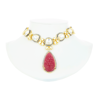Women love jewellery. It not only enhances their confidence level but makes them look beautiful. So, try out this jewellery piece and look like a diva. You can easily bejewel your neckline by sporting this enchanting necklace embellished with Kundan and Ruby stones. This jewellery set comes with a necklace and with a pair of matching earrings secured by back closure. You can pair this jewellery with sarees or gowns and create an enchanting look. This necklace is perfect to be worn for special occasions. The red carbon stone crystals of this necklace hardly can be missed in this traditional necklace design.