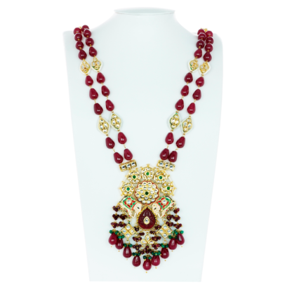 Featuring a multi-layered necklace containing ruby beads, kundan stones and elephant motifs. The centrepiece has kundan embellishments set in a floral pattern, colourful elephants and bright ruby and green droplets. This set contains a pair of earrings with a similar design. Pair this beautiful kundan necklace set with a saree for the ultimate wedding outfit. This green and ruby necklace has a traditional design and can be worn by women of all ages. The elephant motifs have been intricately carved and have superior detailing. This mesmerizing piece will make for a great addition to your jewellery collection.