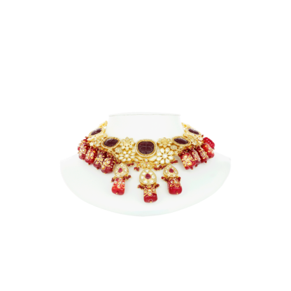 Amp up your look with this polki kundan choker necklace set with a pair of matching earrings. Featuring floral pattern, the necklace is embellished with ruby carving stone and white colour kundan with hydro crystal drops. The earrings are secured with push back closure. Team it with any attire of your choice and look your very best during wedding festivities. This set is perfect to go with any coloured lehenga or saree or gown. The beautiful polish gives the necklace a luxurious look. It should be a part of your traditional wedding jewellery collection. Avoid spraying chemicals or fragrances. Also, avoid contacting it with water to retain the shine.