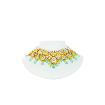 Add a touch of glam to any outfit with this kundanstudded choker necklace set. This set is a fusion of modern and contemporary design. It has been inspired by traditional jewellery but it has a Rajasthani touch. Each piece of this set has been beautifully crafted with white stone and mint beaded details. Perfectly fit for those who are attending any special occasion, like festival celebration, anniversary, birthday party, weddings, and more. Adorn this with an embellished saree and you are ready to steal the show. This floral design set comes with a pair of matching earrings, secured by a push back closure.