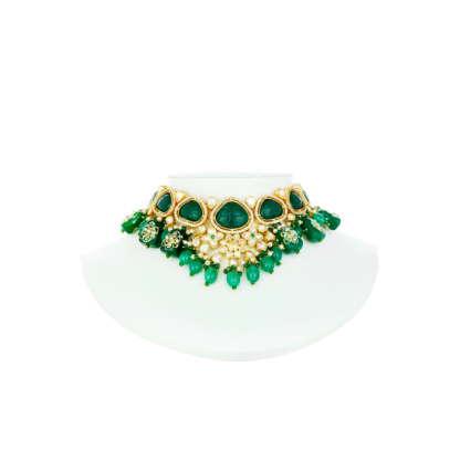 Exude in the royal vibe with this white and green stone studded choker necklace with beaded droplets. This set features an intricate detailing work on the Carving Stone beads. With this traditional necklace with meenakari beads, you have a classy look. With this timeless piece of AD and kundanjewellery, you will definitely get noticed for your style statement. This set is perfect for special occasions, like weddings or festivals, and more. Flaunt this gorgeous Rajasthani style jewellery with ethnic ensembles. This necklace can beautifully blend with the work of your matching gown or lehenga. Add this exquisite necklace set to your jewellery box today!