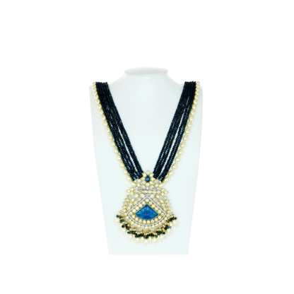 Don this kundan embellished long jewellery set a part of your bridal jewellery collection. It This necklace features a single chain of pearl and multiple layers of blue bead crystals attached to a centrepiece. The chunky centrepiece has blue and white Jaipuri Kundan studded and beaded details. This necklace set is one such stunning piece of jewellery that can create a magic everytime you adorn it. This set will add an elegance to any traditional outfits. But it would surely make heads turn when you pair it with any designer saree. For weddings, this set is a must-have thing. This set consists of a long necklace and a pair of matching drop earrings.