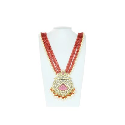 Add this exquisite piece of necklace set to your traditional jewellery collection and get noticed. Wear it with grace to make your own style statement for wedding functions. You can pair it with a saree of any colour and get ready to win a lot of compliments. This jewellery set consists of a kundan studded long multilayered necklace with a big centrepiece and a pair of matching drop earrings. The necklace has a white and pink Jaipuri Kundan and pearl beaded details. The earrings are secured with a push back closure. Always wipe off your jewellery with a soft cloth after every use.