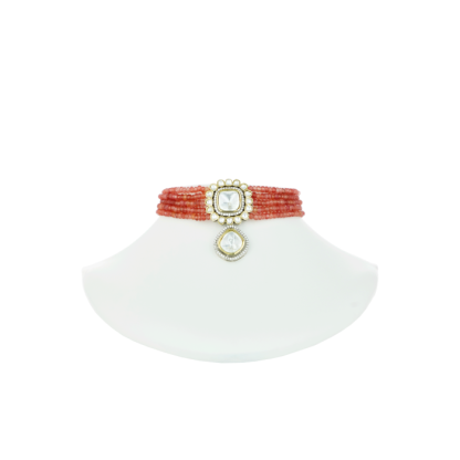 Whether you want to sport a minimalist to a statement look, we have come up with an orange bead choker necklace set that would help you to get the desired look. This traditional necklace set comes with a kundanstudded centrepiece along with a white stone drop from it. Featuring a shining pendant with multiple beaded layers in fine polishing gives this Rajasthani inspired necklace an extra edge. It has a bright look and will pair well with all ethnic attires like sarees. It is perfect for all special occasions and can be worn comfortably for any wedding or festival.