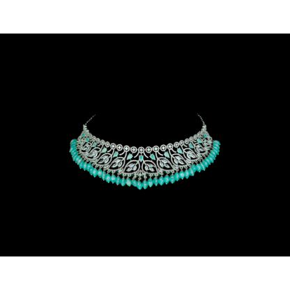 Featuring this beautiful necklace set from our modern jewellery collection. This necklace is studded with high quality white and mint coloured AD stones. In addition, this necklace also comes with a pair of matching drop earrings, which are equally studded with high quality AD stones. The necklace set is coated with rhodium plating, which makes it shinier and more party appropriate. The main attraction of these necklaces is the leafy motifs. You can pair this jewellery set with any lehenga, sarees or suits. For the upcoming special occasion or any part, you can select this jewellery set in order to complete your overall look.