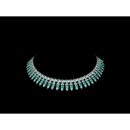 Elevate your elegance with our Modern CZ-American Diamond Hasli Necklace Set. Designed for enchanting party wear, this silver-plated masterpiece effortlessly captivates. The blend of white and mint stones exudes a refreshing charm, adding a touch of glamour to your ensemble. With a delicate mini set size, it harmonizes perfectly with gowns, Indian suits, and sarees. Its universal appeal transcends regional boundaries, while the Hasli design seamlessly blends tradition and modernity. Adorn yourself with this captivating necklace set and shine at any occasion, embodying timeless beauty and contemporary finesse. Redefine your style with a touch of alluring sophistication.