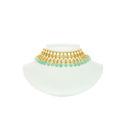 Combinations of white and mint colours are currently in trend. Take a look at this choker set embellished with pearl and mint beads, perfect for a wedding or party occasion. If you have a big fat Gujarati or Punjabi wedding to attend, this is the perfect time to use this choker set. The set includes gold-plated jhumkas with white Kundan stones, pearls, and mint-colored beads. This gorgeous set can be paired with any traditional lehenga. Pastel-colored lehenga will go better with this choker set. You can wear the earring or the chokers separately as per your liking.