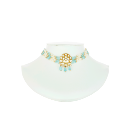 A layered choker with a Kundan embellished locket at the center is what you will require to stand out at the party. If you are currently searching for something traditional yet party appropriate to pair with your saree, this Kundan choker set is perfect for you. The choker is designed with white and sky blue beads along with a gold-plated locket studded with white Kundan and sky blue beads. You can pair this gorgeous set with any dark blue, light blue, or white saree. You can wear this set at any moment regardless of the daytime or nighttime occasion.