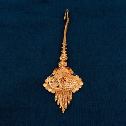 Add a touch of elegance to your bridal ensemble with our stunning gold-plated tika, beautifully adorned with intricate maroon, yellow, and blue meenakari work. This exquisite piece is perfect for weddings and traditional occasions, making it a must-have accessory for brides and bridesmaids alike. The vibrant colors and delicate design complement sarees and lehengas, enhancing your overall look with a traditional flair. Crafted with care and precision, this tika not only reflects cultural heritage but also showcases your unique style. Elevate your wedding attire and make a lasting impression with this gorgeous traditional tika!