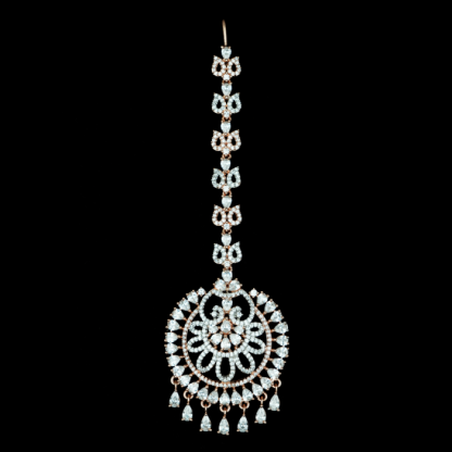 Featuring a white AD studded tika that will prove to be a showstopper for a party look. People will go amazed looking at the drops, and round and floral designs intricately present in the tikas with rose-gold plating. These thin, stylish tikas will make you look like a diva. They are quite comfortable and simple to wear and you can carry them for a significantly long time. You’ll feel majestic wearing these stunning tikas with AD drops. This may be a wise decision if you’re looking for a classy gift for a loved one. Utilize this tika to incorporate beauty and fashion into your styling. They are appropriate for use at events like weddings and parties with a designer saree or lehenga. You can even pair it up with a gorgeous lehenga on your engagement or sangeet night for a sleek yet stunning look.