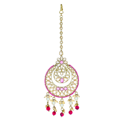 Featuring a gold-plated maang tikka embellished with reverse American diamonds and pearl and bead drops. This maang tikka has a dainty Patti with bright stones and a big centrepiece in the shape of the moon. This Chand-shaped centrepiece has pink and white stones that add colour and shine to its look. You will look classy and charming with this modern maang tikka that can be paired with lehengas of white and pink colour. You can wear it on any special occasion like a wedding. This mehendi-plated maang tikka with ruby stones is the perfect hair accessory for today’s stylish woman.
