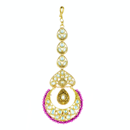 Exquisitely made with pretty pink stones, and kundan, this stunning maang tikka will be the ideal addition for all jewellery collections. You can style it with neutral makeup and a sophisticated hair bun with flowers to match the floral pattern in the maang tikka. This maang tikka has a traditional design and can be worn at weddings. Pair it with a lehenga for an elegant ethnic look. This maang tikka has an intricate floral pattern in its centrepiece while the pink stones add colour and brightness to its look.